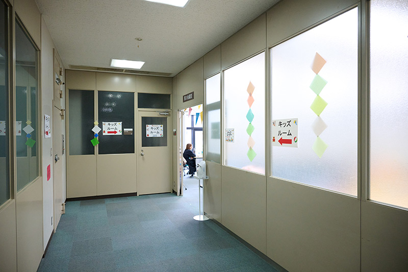 会場の床が絨毯仕様になっており、おもちゃスペースはジョイントマットを敷いて靴を脱いでご利用いただけるようになっております。